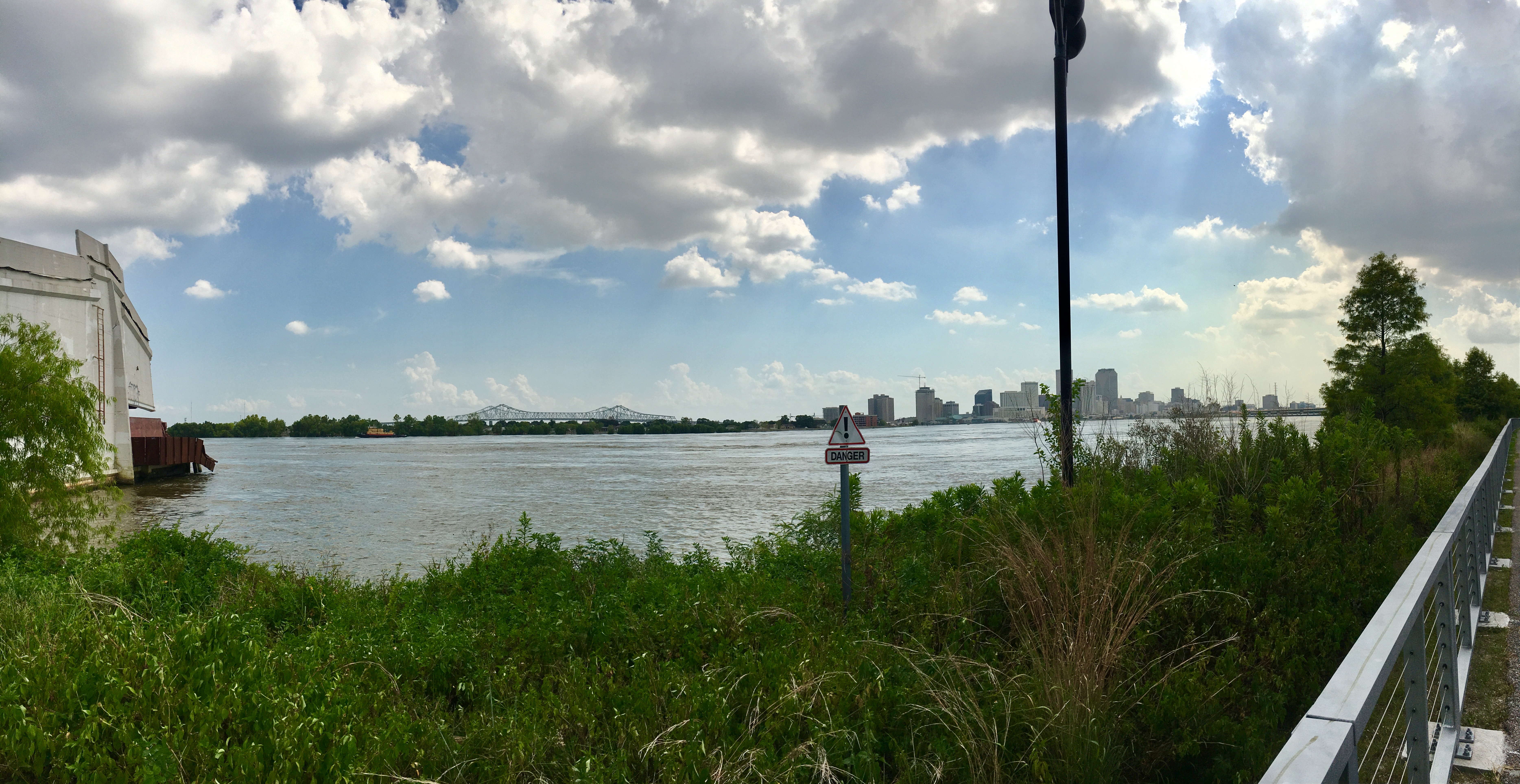 A Panoramic shot of an actively developing New Orleans skyline; in the foreground, a smashed Piety Warf and a signaled dangerous bank of the Mississippi River, both off limits to the public
